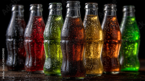 Row of assorted flavored soft drinks in glass bottles, vivid colors with transparent liquid and glossy reflections, subtle drops of condensation, sparkling fresh and cold beverage