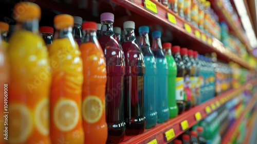 row, colourful, bottle, soda, juice, shelf, rainbow, supermarket, drink, orange, beverage, left, store, retail, middle, green, pattern, sale, shop, market, plastic, grocery, business, display, choice, soft, sweet, aisle, brand, client