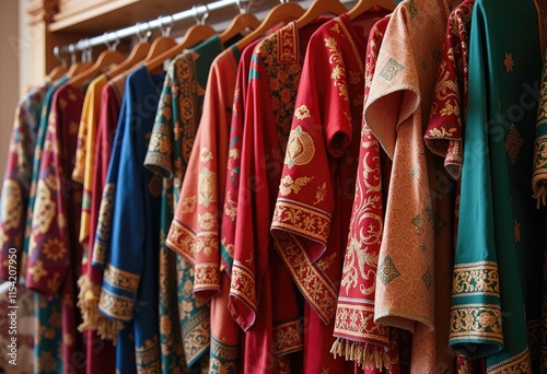 robe, robe, garment, garment, clothing, colourful, patterned, fabric, textile, embroidered, design, ornate, intricate, hanging, hanger, shop, display, fashion, style, traditional, ethnic, cultural, vintage, retro, luxurious, elegant, formal, ceremony, celebration, festival, religious, spiritual