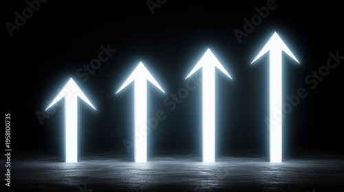 arrow, glowing, white, dark, background, growth, progress, concept, light, upward, row, height, increasing, digital, tech, futuristic, abstract, minimal, design, movement, business, graph, chart, signs, success, diagram, symbol, finance, financial, market, economy, icon