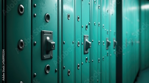 Row of green lockers with a silver knob on the front. The lockers are empty