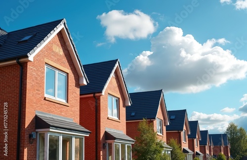 Row of modern brick houses. Homes have dark roofs and bright windows. Blue sky with white fluffy clouds creates a nice atmosphere. Real estate property.
