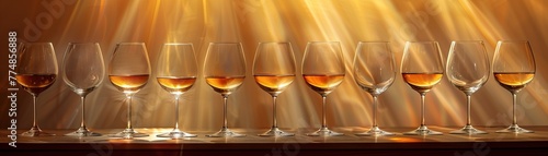 Row of various wine glasses with different types of wine, elegantly backlit. Tasting and degustation concept