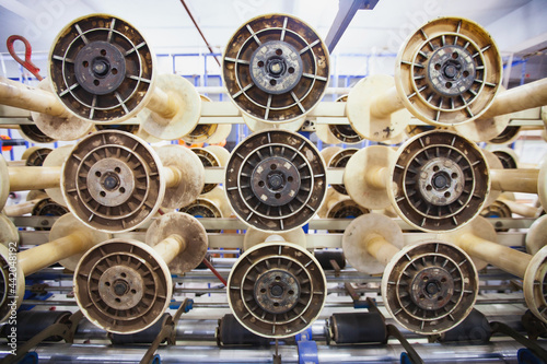 spindle, factory, manufacturing, industry, industrial, machine, idle, row, column, facility, interior, mechanism, metal, gear, vintage, gear, technology, inside, mechanical, steel, wheel, business