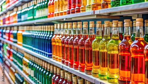 Rows of colorful alcohol bottles neatly displayed on a shelf in a supermarket , liquor, bottles, alcohol, shelf