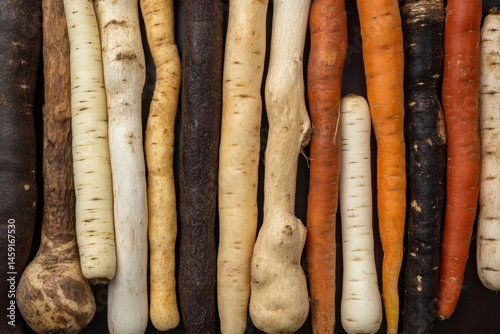 root, vegetable, row, colourful, variety, pale, dark, orange, red, white, black, brown, yellow, long, straight, fresh, produce, healthy, food, natural, organic, closeup, closeup, texture, line, different, contrast, vibrant, display, arrangement, background, diet, nourishment, freshness, raw, cooking, ingredient, cookery, nature, image, pattern, detail, quality