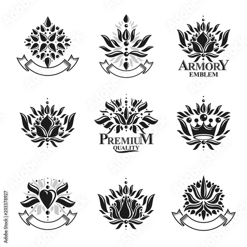 Royal symbols, Flowers, floral and crowns, emblems set. Heraldic vector design elements collection. Retro style label, heraldry logo.