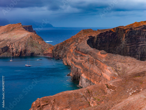 Rugged rust colored cliffs drop into a deep blue bay at Ponta de Sao Lourenco, Madeira Island, Portugal, small boats anchor, moody clouds and angled light add contrast.
