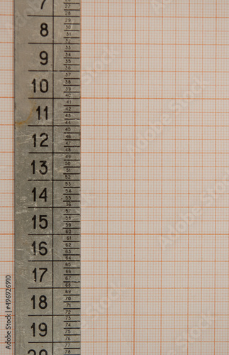 ruler made from metal lie on a graph paper with copy space for text. Math graphic tools concept.