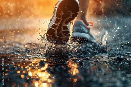 Runner running in a rain and splashes from puddle