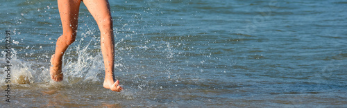 Running child girl legs on the beach and copy space
