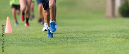 Running children, young athletes run in a kids run race, running on grass detail on legs, running in the light of morning