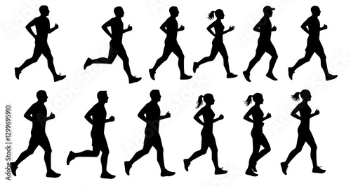 Running men and women, isolated vector silhouettes. Run, side view. Silhouettes of athletic looking male and female runners running. Transparent PNG version.