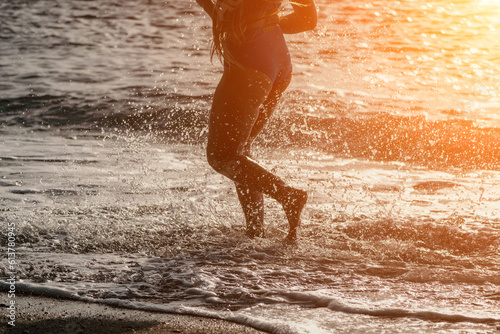Running woman on a summer beach. A woman jogging on the beach at sunrise, with the soft light of the morning sun illuminating the sand and sea, evoking a sense of renewal, energy and health.