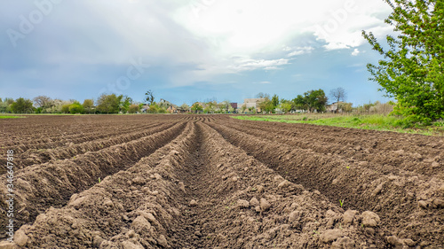 agriculture, field, plowed, landscape, land, spring, nature, rural, earth, dirtied, background, cultivated, farm, sky, brown, dirt, farmland, ground, countryside, farming, scene, agricultural, season, tillage, plough, striped, blue, environment, industry, ploughed, row, country, green, natural, horizon, meadow, cloud, grooved, view, pattern, sunlight, organic, sowing, texture, crop, growth, humus, plant, nobody