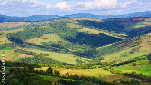 rural landscape of carpathian mountains. beautiful countryside scenery in autumn season with fields on the hills in the valley