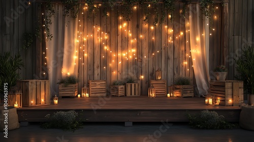 Rustic barn wedding stage with wooden crates and fairy lights A wooden stage is set up inside a barn, decorated with rustic elements like wooden crates, lanterns, and strings of warm fairy lights.