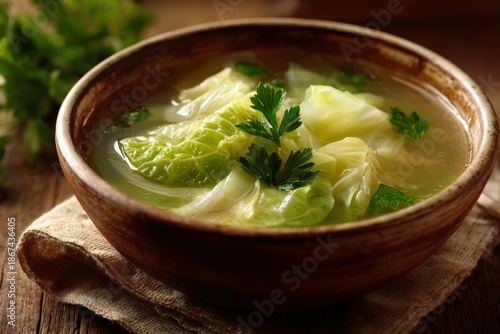 cabbage, soup, rustic, ceramic, bowl, parsley, garnish, broth, cosy, comforting, wooden, table, earthy, texture, fresh, green, slice, light, clear, homemade, healthy, meal, vegetarian, vegan, organic, natural, kitchen, cooking, culinary, delicious, appetising, warm, hearty, simple, traditional, food photography, dining, receipe, nourishment, wholesome, savoury, herb, table setting, comfort food