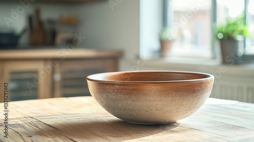 Rustic ceramic bowl sits on a wooden table in bright kitchen. Ideal for food blogs, healthy eating, or kitchen-themed designs.
