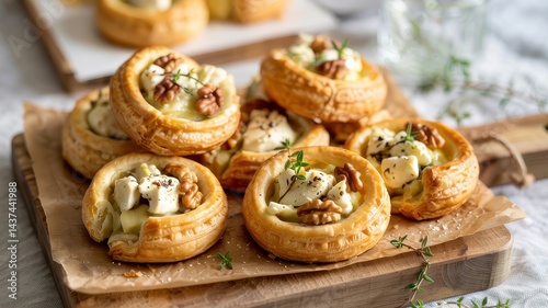 tart, pastry, walnut, cheese, thyme, flaky, savoury, food, snack, rustic, epicure, baked, creamy, lunch, texture, culinary, crust, gold, topping, pie, plate, wooden, mini, small, homemade, herb, finger food, rich, salty, artisan, cookery, catering, crunchy, fresh, elegant, dish