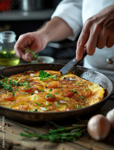Rustic Close Up of Tortilla Espanola with Rosemary Garnish