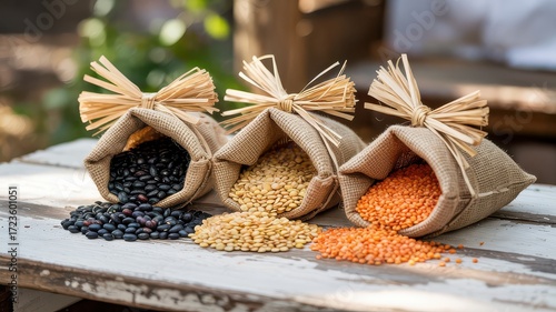 Rustic Display Dried Legumes Black Beans Soybeans Red Lentils Spilling from Burlap Sacks with Raffia Bows on Weathered White Wooden Surface Outdoors