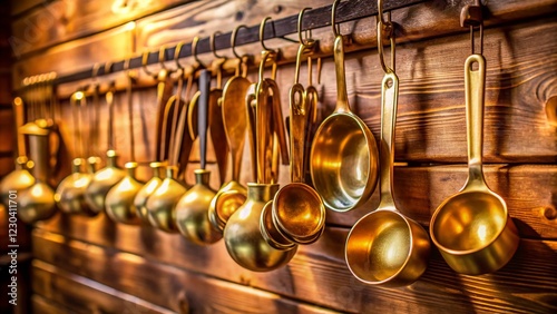 brass, kitchen utensile, copper, home decor, food photography, home cooking, kitchen utensile, measuring, cooking, baking, vintage, antique, metal, polished, shiny, hanging, hook, wooden, closeup, detail, texture