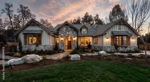 design, window, lawn, home, exterior, building, architecture, stone, warm, wooden, natural, landscaping, residential, front, house, garden, twilight, facades, daylight, tree, peaceful, evening, cosy, classic, wood, light, rural, shutter, dusk, elegant, property, charming, farmhouse, countryside, modern, tranquil, suburban