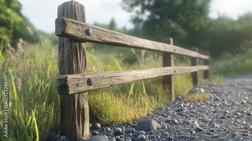 Rustic fence, on country roadside, summer grasses, tranquil meadow view, nature background