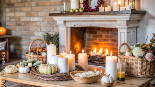 Rustic fireplace with candles and autumn decor for cozy home warmth