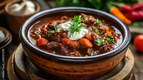 goulash, paprika, sour, cream, artistic, presentation, soft, sharpened, rustic, background, bowl, savoury, dish, cook, meal, vegetable, herb, spice, delicious, hearty, stew, food, culinary, cookery, comfort, warm, fresh, organic, photo, favor, vibrant, colours, table, wooden, home, style, serving, plate, atmosphere, inviting, seasonal, preparation, traditional