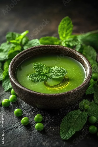 Rustic Green Pea Soup with Fresh Mint Garnish on Dark Stone Background