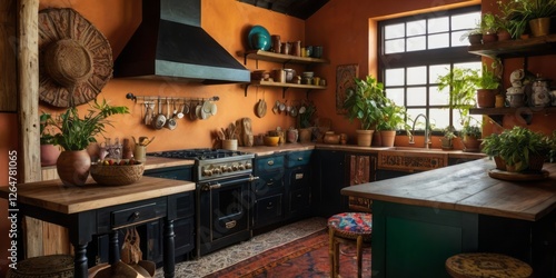 kitchen, rustic, warm, tone, earthy, element, decor, orange, wall, dark, cabinet, wood, shelf, plant, pot, greenery, farmhouse, style, vintage, antique, copper, utensil, cooktop, oven, range, hood, handcraft, texture, natural, material, sink, counter, island, stool, woven, hat, bowl, fruit, artwork, eclectic, bohemian, cosy, inviting, home, design, room, space