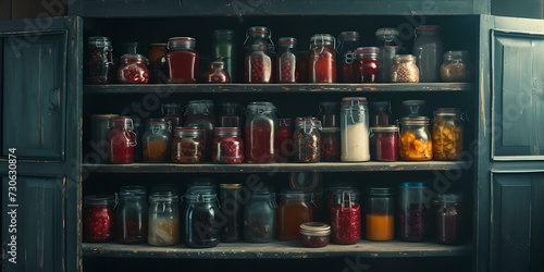 kitchen, rustic, shelf, jar, spice, preserving, home, cooking, interior, pantry, wooden, storage, background, domestic, lifestyle, organisation, culinary, vintage, shelf, homemade, bottle, container, assorted, traditional, ingredient, kitchen utensile, household, seasoning, country style, cookery, ai