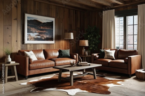 Rustic Living Room 3D Render Featuring Leather Couch Wooden Coffee Table and Animal Skin Rug in Cozy Apartment Design