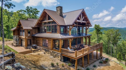 Rustic mountain cabin plan featuring a loft and expansive deck