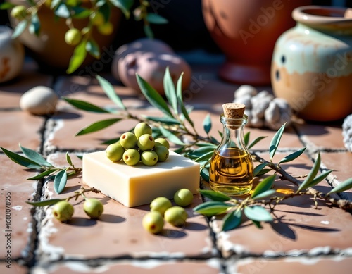 rustic, natural, earthy, serene, organic, tranquil, relaxing, fresh, countryside, rural, peaceful, shaded, warm, soft, gentle, ambient, textured, botanical, greenery, leaf, olive, oil, soap, still life, background, harmony