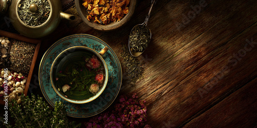Rustic still life of herbal tea set with teapot cups and assorted dried herbs on wooden table - AI generated