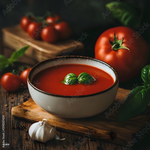 Rustic Tomato Soup with Fresh Basil Leaves and Ingredients on Wooden Board