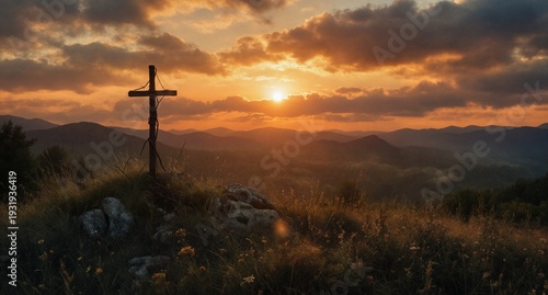rustic wooden cross silhouetted against a vibrant mountain sunset landscape.