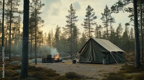 forest, campground, timberland, campfire, tent, outdoors, nature, wilderness, evening, sunset, sunrise, light, shadow, tree, pine, wood, rock, ground, grass, smoke, fire, heat, camping, equipment, gear, travel, adventure, hiking, exploration, calm, peaceful, quiet, landscape, scene, calmness, calmness, rustic, grey, brown, gold, orange, cotton, canvas, barrel, cooking, woodman