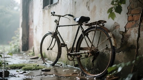 Rusty Bicycle Leaning Against a Weathered Wall in a Rainy Alley