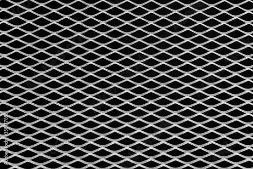 Rusty metal grid with geometric pattern of rhombi, black and white background