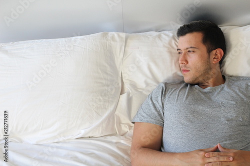 man, bed, empty, white, sad, background, alone, bedchamber, pillow, unhappy, depressed, home, person, sitting, male, serious, grieved, upset, indoor, place, disease, problem, thinks, sick, depression, bad, frustration, bankruptcy, despair, worried, stressed, suffer, impotence, health, young, blank, emotion, pain, lonely, trouble, duvet, linen, portrait, adult, hispanic, loss, latino, asian, 20s