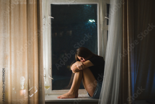 Sad woman sit barefoot on window sill