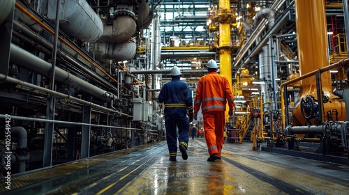 safety, oil, refinery, men at work, industrial, processing, facility, machinery, environment, teamwork, operation, walking, maintenance, equipment, engineering, production, service, management, infrastructure, labor, construction, procedure, efficiency, technology, support, energy, system, safety-gear, orange, helmet, uniform, man, workplace, project, status, monitoring, supervision, control, process, inspection, pipeline
