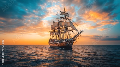 Sailing ship at sunset. Ocean adventure, travel, and exploration concept.