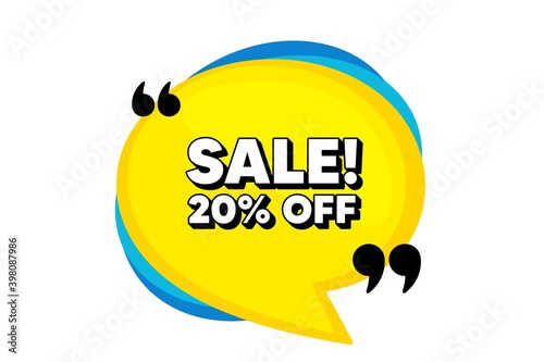 Sale 20 percent off discount. Yellow speech bubble banner with quotes. Promotion price offer sign. Retail badge symbol. Thought speech balloon shape. Sale quotes speech bubble. Vector