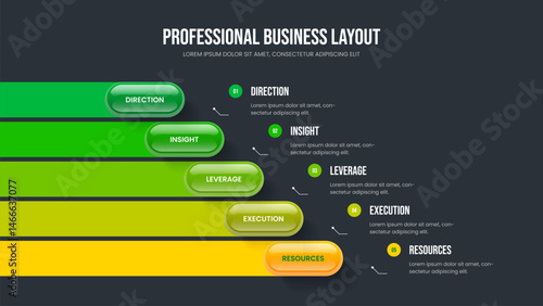 Sales Portfolio 5 Element Infographic Presentation Template. Investor Introduction Slide Layout Vector Illustration. Financial Strategy Five Step Diagram Frame Design.
