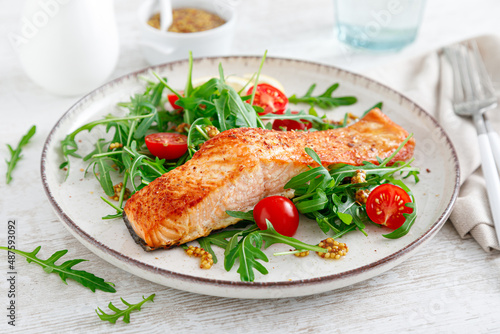 Salmon fish fillet grilled and fresh vegetable tomato salad with arugula. Healthy food. Ketogenic diet. Lunch